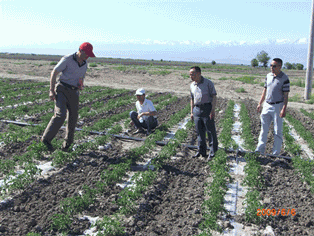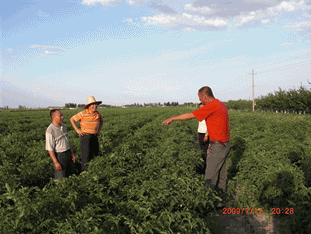 圖為昌吉市土肥站于站長與公司總經(jīng)理到番茄示范地察看 圖為農(nóng)八師150團(tuán)畝產(chǎn)8000kg的番茄示范地