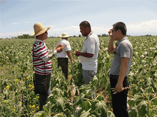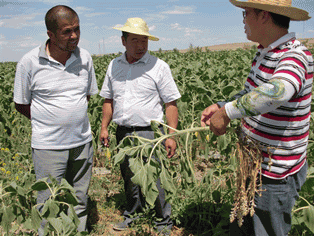2012年7月,公司委派總農(nóng)藝師劉軍帶領(lǐng)科技服務(wù)組下到新疆兵團(tuán)農(nóng)十師傳授“施地佳”土壤改良劑施用技術(shù)組圖