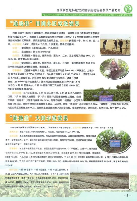 2014年8月21日,“2014年新型肥料肥效試驗現(xiàn)場培訓(xùn)在甘肅張掖市召開”。來自全國各省、市相關(guān)技術(shù)人員共計100余人參加培訓(xùn)。成都華宏生態(tài)農(nóng)業(yè)科技有限公司總經(jīng)理李智強,攜公司高管參加了這次培訓(xùn)。與會人員還參觀了全國農(nóng)技推廣服務(wù)中心在全國選出的七個新型肥料品種在張掖市的試驗示范。成都華宏生態(tài)農(nóng)業(yè)科技有限公司自主研發(fā)的“施地佳”土壤調(diào)理劑也被安排在甘州區(qū)烏江鎮(zhèn)賈寨村一社趙建國的承包地試驗,試驗作物是玉米。根據(jù)田間記載:4月22日播種,5月2日出苗,6月10進(jìn)入拔節(jié)期,6月25日進(jìn)入大喇叭口區(qū)期。7月18日進(jìn)入抽穗期。于7月3日進(jìn)行示范田植株性狀調(diào)查,施用“施地佳”土壤調(diào)理劑,大田平均株高135.5cm,較對照區(qū)增高10.1cm,莖粗為9.3cm,均較對照區(qū)增粗0.5cm,施用“施地佳”土壤調(diào)理劑后,示范田苗齊苗壯、植株葉色濃綠,長勢較強。預(yù)計增產(chǎn)5—6%。