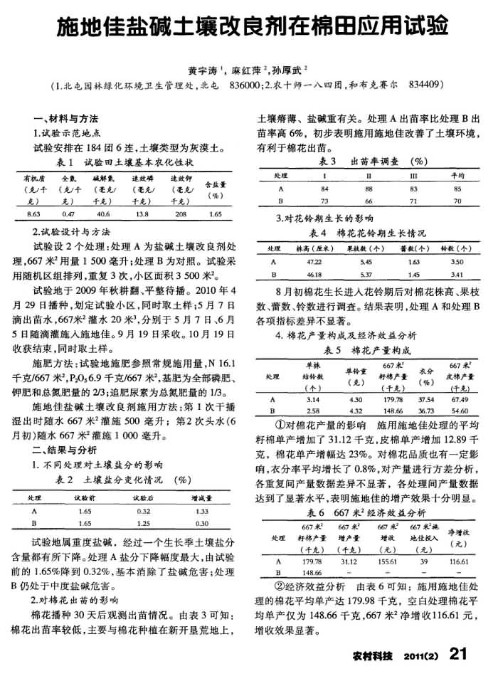 《農(nóng)村科技》2011年第2期 “施地佳”鹽堿土壤調(diào)理劑在棉田應(yīng)用試驗