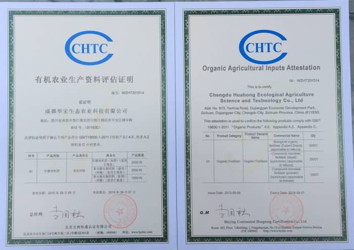 今年9月初,成都華宏生態(tài)農業(yè)科技有限公司通過對國家有機農產品認證的標準的自我衡量,向國家認證權威機構申請,經過嚴格的認證考核,獲得以下三個產品的有機認證:(1)“助邦”牌生物有機肥、(2)“神鋤”復合微生物肥料(液體)、(3)“神鋤”復合微生物肥料(粉劑),這是我公司長期以來倡導和注重生產綠色產品,保障民眾健康的理念的結果。