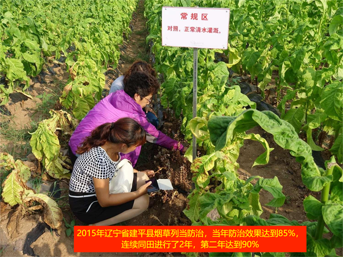 2015年遼寧省建平縣煙草列當(dāng)防治,當(dāng)年防治效果達(dá)到85%,連續(xù)同田進(jìn)行了2年,第二年達(dá)到90%