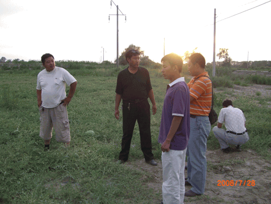 圖為:公司總經(jīng)理、總農(nóng)藝師和團(tuán)場技術(shù)員在124團(tuán)9連打瓜地里察看