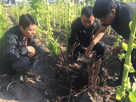 成都華宏總經(jīng)理李智強(qiáng)在鎮(zhèn)賚縣煙草種植大戶試驗(yàn)田防治列當(dāng)成功,煙農(nóng)稱今年煙葉是最好的、畝產(chǎn)可達(dá)400斤