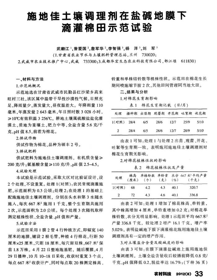 《新疆農(nóng)墾科技》2012年第8期 “施地佳”土壤調(diào)理劑在鹽堿地膜下滴灌棉田示范試驗(yàn)