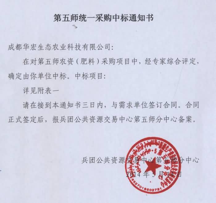 公司產(chǎn)品中標(biāo)新疆兵團第五師農(nóng)資采購項目