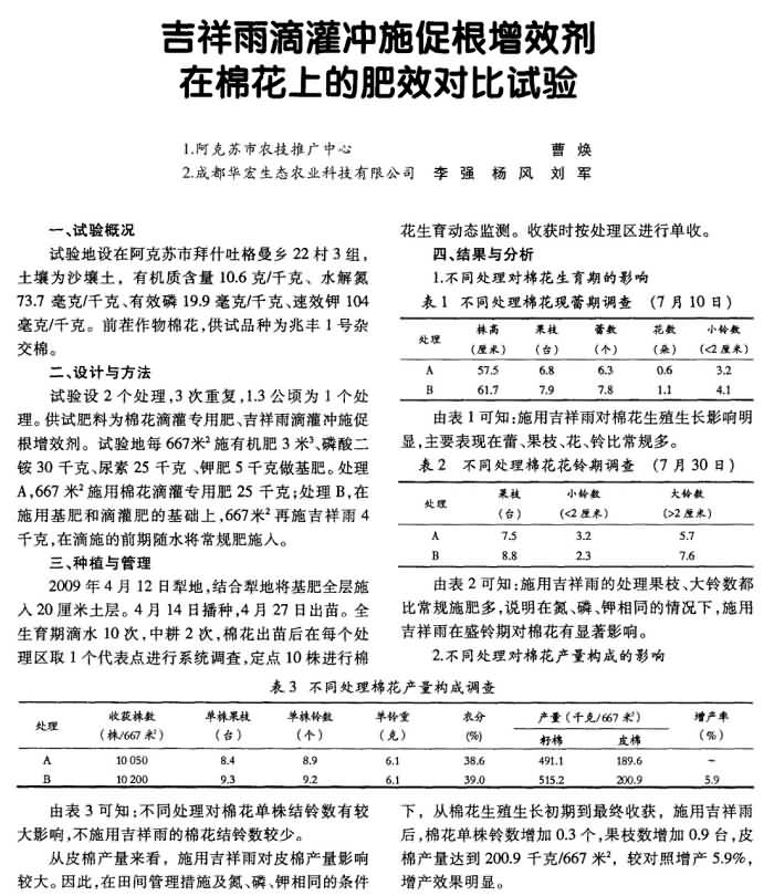 《農(nóng)村科技》2010年第8期 “吉祥雨”滴灌沖施促根增效劑在棉花上的肥效對比試驗