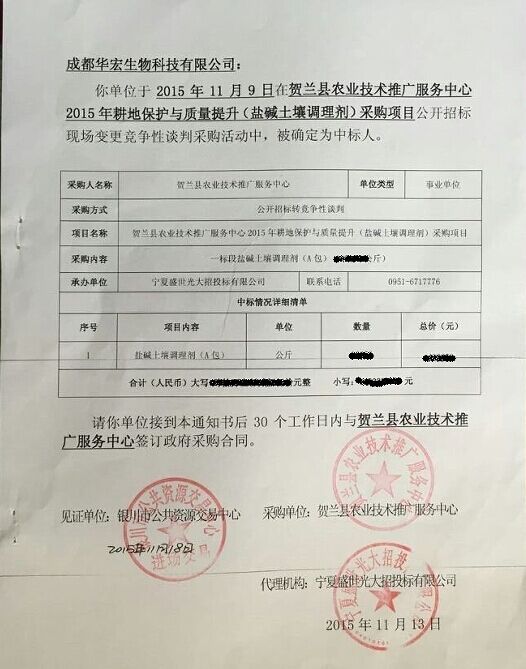 不久前,國內(nèi)土壤調(diào)理劑產(chǎn)品研發(fā)生產(chǎn)先導型企業(yè)——成都華宏生態(tài)農(nóng)業(yè)科技有限公司,收到了一份特別的通知書,“賀蘭縣政府采購”幾個大字分外顯眼,無不讓人感覺這份通知書的分量十足。筆者了解到,這是該企業(yè)參與賀蘭縣農(nóng)業(yè)技術(shù)推廣服務中心“2015年鹽堿土壤調(diào)理劑采購項目”投標的中標通知書,該通知書的取得也意味著成都華宏在同類投標中連續(xù)四年中標,如此傲人的成績在業(yè)內(nèi)還不多見。