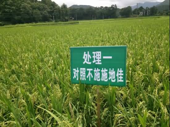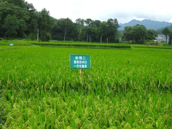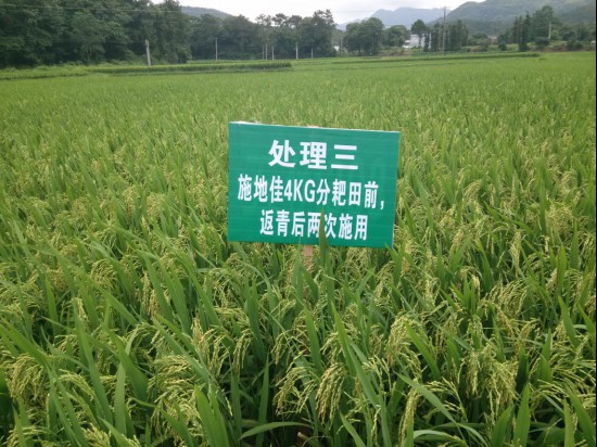 處理二中,農(nóng)民在采用習(xí)慣施肥方式的基礎(chǔ)上,每hm2使用施地佳調(diào)理劑60公斤,在插秧前耙地時(shí)間節(jié)點(diǎn)一次性?xún)端疂姙⒃谔锢锇业睾蟛逖怼?/span>