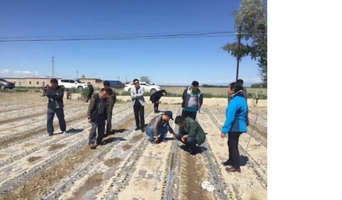 圖片說明2:89團領導親自過問種植戶情況,種植戶匯報了這兩年使用情況,效果很好。