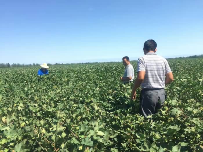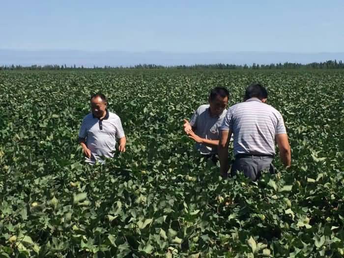 2016年在新疆生產(chǎn)建設(shè)兵團(tuán)第五師實(shí)施“神鋤”微生物功能菌劑防治棉花枯萎、黃萎病。小區(qū)實(shí)驗(yàn)和大田應(yīng)用同時(shí)進(jìn)行,公司總農(nóng)藝師劉軍與區(qū)域負(fù)責(zé)人小秦今天在實(shí)驗(yàn)田調(diào)查,到八十一團(tuán)六連與團(tuán)生產(chǎn)科姜濤科長(zhǎng)、連隊(duì)技術(shù)員李文在示范地田間調(diào)查和測(cè)試產(chǎn)量,發(fā)病率與對(duì)照田降低70%,平均培產(chǎn)超10%。八十三團(tuán)十二連張連長(zhǎng)介紹,往年病害發(fā)生嚴(yán)重,今年應(yīng)用神鋤生物菌防治,得到很好的抑制,在整個(gè)示范田沒(méi)有發(fā)生病害,畝產(chǎn)達(dá)350公斤以上用戶今年豐收在望!