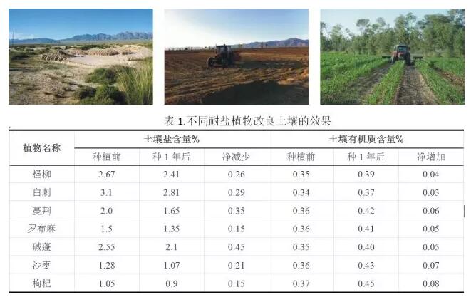 種植一些耐鹽堿植物,在利用植物降低水分蒸發(fā)的同時通過植物回收鹽堿地土壤中的鹽分。種植耐鹽堿地植物后重鹽土含鹽量會有所降低,有試驗結果表明每公頃的鹽地堿蓬和堿爪爪每年可以從鹽堿土中分別吸收2294.6kg和2792.7kg的鹽分(NaCl);灌木樹種白刺,基本上可以降低土壤表層鹽分50%~70%。
