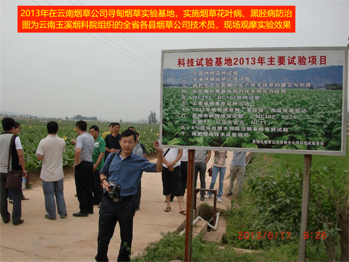 2013年在云南煙草公司旬甸煙草實(shí)驗(yàn)基地,實(shí)施煙草花葉病、黑脛病防治